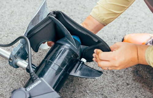 Null Aufwand! Das „Jackall Prop Cover“ ist eine Propellerabdeckung, die mit einem einzigen Handgriff angebracht werden kann und dient zur Abdeckung zum Schutz des Propellers eines Elektromotors. Der Propeller ist ein wichtiges Element, dessen Beschädigung direkt die Manövrierfähigkeit des Elektromotors beeinträchtigt und auch das Angelergebnis beeinflussen kann.