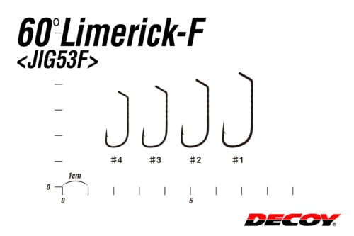 Die Decoy JIG53F 60 Limerick-F wurden mit ihrem 60° Winkel der Öse für das s.g. Spine-Rig entwickelt, bei welchem der Gummifisch zusätzlich mit einem Nailsinker beschwert wird.